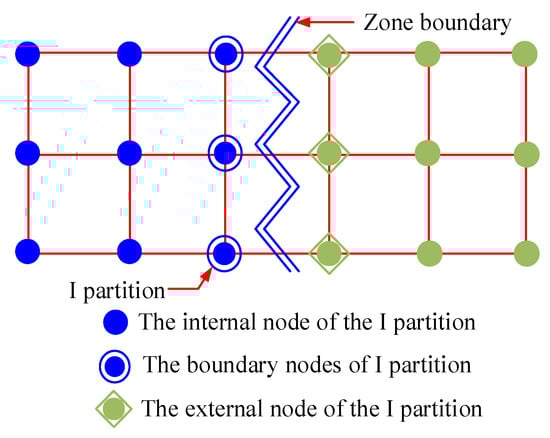 This parallel computing structure uses a master–slave programming model, dividing the computational process into several slave processes (see Figure 2). It is a control program that does not participate in calculations, but is responsible for obtaining global machine numbers, initializing data, and processing data before receiving it. The data include unit information, node information, and material properties. According to the domain decomposition algorithm (See Figure 3, where the grid nodes in the I partition are divided into two types: internal nodes and boundary nodes. When solving the physical quantity of the partition boundary node, it is also necessary to exchange information with the adjacent area of the I partition to obtain the information of the node connected to the boundary of the I partition, that is, the information of the external node. The internal nodes and boundary nodes are the nodes to be solved in the I partition. When solving the boundary nodes, the external nodes are auxiliary nodes that provide boundary information), the program automatically decomposes the entire solution region into relatively independent sub-regions, and distributes the sub-region data into the corresponding processors. When the calculation of each slave process is completed, the master process retrieves the results of each sub-region from each slave process. It outputs the results of the entire solution region. Each slave process is a calculation program responsible for completing subtask calculations. Each slave process receives the master process data and individually completes the unit stiffness matrix, the total stiffness matrix synthesis, and the load vector assembly of each sub-region. The sub-region system equations are solved iteratively using the Krylov subspace preconditioner biconjugate gradient stabilized method. It is necessary to exchange data with adjacent sub-regions to update the data during solving. The sub-area solution is completed via the slave process, and the physical quantities of the stress and strain waiting to be solved are output into the master process.