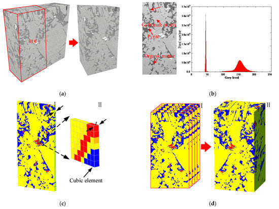 Reconstructing digital models based on digital images has been applied in fields such as petroleum engineering [,]. Previous studies have shown that digital image data, such as mineral and fracture data, can be used to characterize the heterogeneity of materials quantitatively []. Digital image processing (DIP) technology can accurately introduce the heterogeneity of materials into numerical models, and depict the physical qualities and microstructures of actual materials more accurately [,,]. These investigations have shown that models that take into account real microscopic heterogeneity may better predict materials’ mechanical behavior and fracture reactions. However, these studies are limited to the establishment and research of two-dimensional (2D) numerical models.