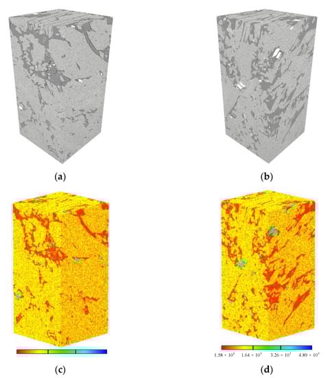 Shale microscopic model. (a,b) Original FIB-SEM 3D model: (a) is a front view, and (b) is a back view. (c,d) Finite element numerical model, expressed by elastic modulus: (c) is a front view, and (d) is a back view. (