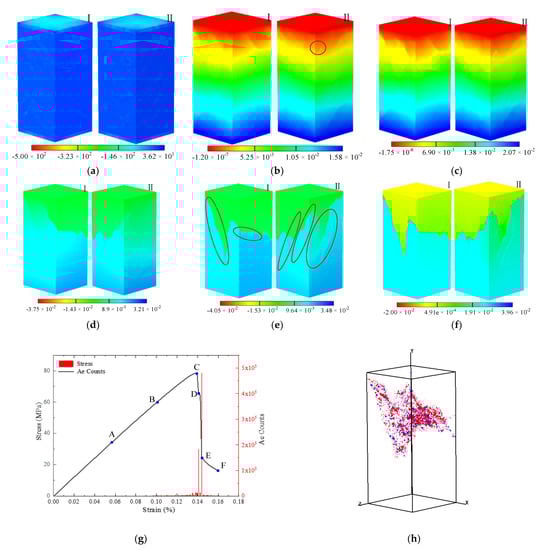 Numerical simulation of the shale sample at the microscale. (a) Minimum principal stress. (b–f) Vertical displacement contours at different loading stages, (a–f) correspond to points A–F in (g), respectively. (I) front view, and (II) back view. (g) The spatial distribution of acoustic emission (AE) events. (h) The stress–strain curve associated with AE counts for shale. The unit of stress in (a) is the MPa, and the unit of displacement in (b–f) is the millimeter.