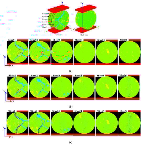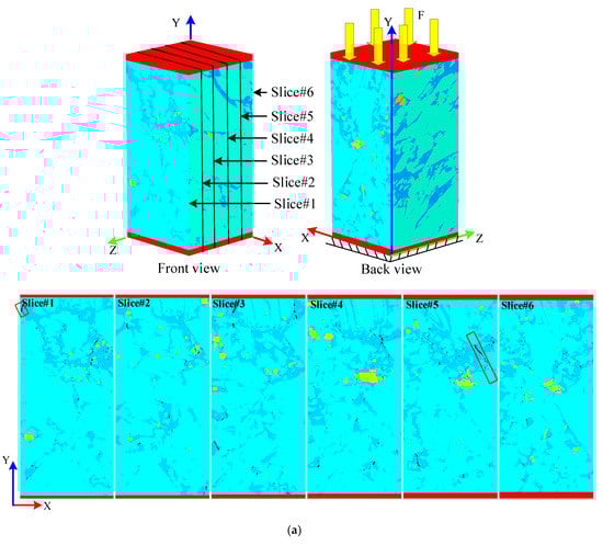 Figure 11 shows the internal failure processes of meso Brazilian disk models at different loading stages. Dark blue represents damage elements and black represents failure elements. The six slices (Slice#1, Slice#2, Slice#3, Slice#4, Slice#5, and Slice#6) are located at distances of +Z 2.0, 1.6, 1.2, 0.8, 0.4 and 0 mm. Figure 11a–f correspond to points A–F on the load–displacement curve in Figure 10g, respectively. By observing slice#1 and silce#2, it can be seen that the damage occurs near the center of the Brazilian disc. However, the initial fractures begin on the central axis near the upper and lower loading plates of the Brazilian disk, and continue to expand in the direction of organic matter until they merge into one main fracture. In the lower parts of the Brazilian disc, the fracture no longer propagates along with the organic matter because it is farther away from the central axis, and therefore it turns towards the central axis. The initial stages of loading are not damaged, as can be seen in slices #3–6. In response to the increased external load, some elements are damaged or fail at the central axis, but no macroscopic cracks appear. It is not until after the peak point that cracks are formed near the upper and lower loading plates, respectively. Although the cracks rarely extend, they only remain near the loading plate until the specimen is a mode of completely unstable failure.