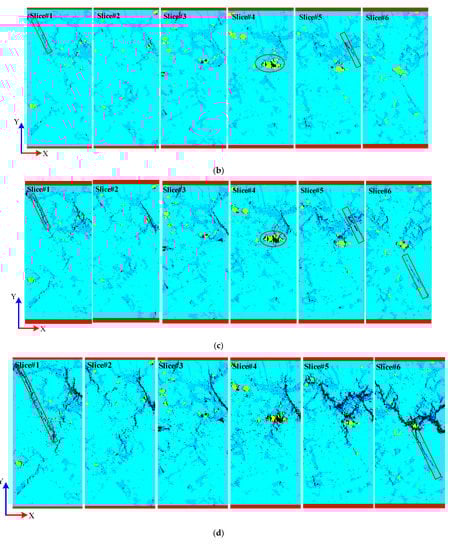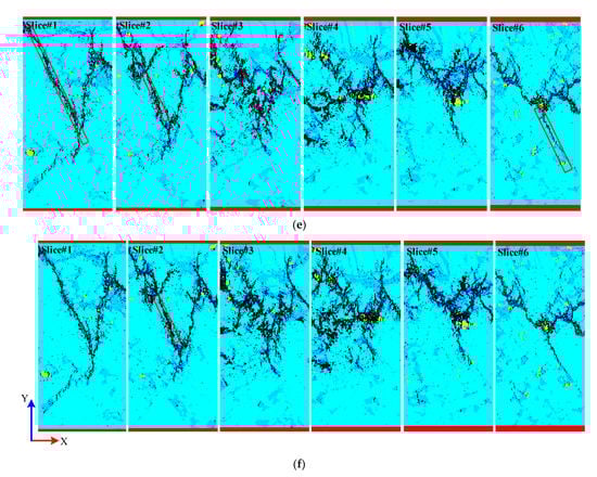 Internal fracture evolution in a shale meso sample sliced along different Z planes. (a–f) The slices are at different loading stages, corresponding to points A–F in Figure 10g, respectively. (
