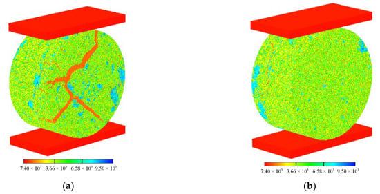 A three-dimensional numerical model of the Brazilian disc at the mesoscale, expressed by elastic modulus. (a) is the front view, and (b) is the back view (
