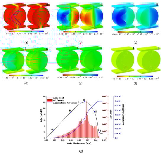 Numerical simulation of the shale sample at the mesoscale. (a) Maximum principal stress. (b–f) Vertical displacement contours at different loading stages, (a–f) correspond to points A–F in (g), respectively. (I) front view, and (II) back view. (g) The stress–strain curve associated with AE counts for shale. The unit of stress in (a) is the MPa, and the unit of displacement in (b–f) is the millimeter.