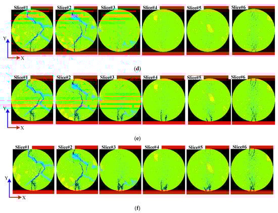 Internal fracture evolution in micro shale sample sliced along different Z planes. (a–f) The slices at different loading stages, corresponding to points A–F in Figure 6g, respectively. (