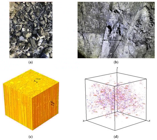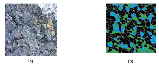 The above methods are used to characterize the heterogeneity of rock materials; they are random-level models that cannot entirely reflect the actual geometric changes taking place in the microstructures of the materials []. Additionally, few documents describe how the virtual structure generated by this method reflects the natural structure of the rocks []. The internal microstructure and composition determine the macroscopic mechanical properties of rocks, and the contours of different components determine their macroscopic fracture mechanisms []. Therefore, the actual internal structure of rocks should be considered as much as possible in mechanical analysis and fracture research [].