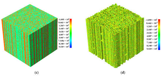 The objective of this section (Figure 4a(II)) was to select the region of interest from Figure 4a(I)), the size of which was about 15 × 7.5 × 7.5 μm. In an attempt to increase the calculation speed without affecting the calculation accuracy of the model, when constructing the numerical model, the pixels of the image were reduced five-fold, and one image was taken at intervals (the size of the element is 50 × 50 × 50 nm). The method introduced in Section 2.3 reconstructs the three-dimensional numerical model of shale at the microscopic scale, as shown in Figure 5c,d ((c) front view, (d) back view), represented by the elastic modulus diagram. Comparing Figure 5a,b and Figure 5c,d, it can be found that the reconstructed numerical model (Figure 5c,d) reproduces the real microstructure of the shale well, and the introduction of inhomogeneous coefficients characterizes the inhomogeneity of single minerals more realistically, which makes the reconstructed numerical model more natural and realistic. The total number of finite element elements in the specimen section is 6.75 million. The blue mineral is pyrite, the yellow mineral is the carbonate matrix dominated by calcite, and the red mineral is organic matter.