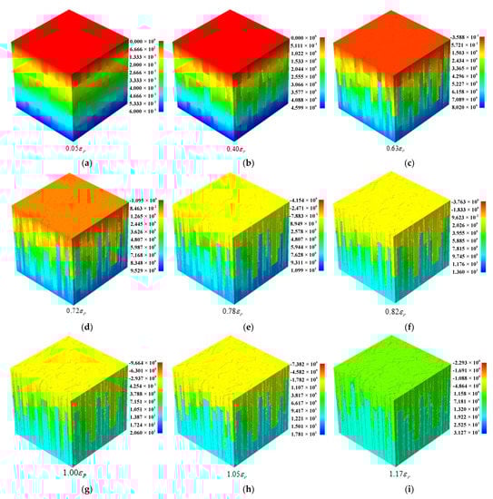Numerical uniaxial compression test of columnar jointed basalt at the macroscale. (a–i) Vertical displacement contours at different loading stages, (a–i) correspond to points A–F in Figure 15. The unit of displacement in (a–i) is the millimeter.