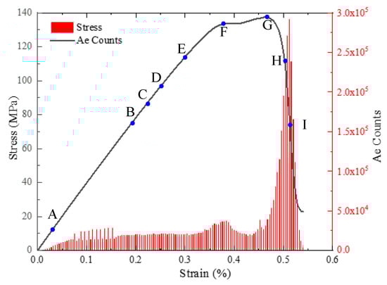 The stress–strain curves of CJRM are different from those of intact rock samples, and the brittle characteristics of intact rocks are significantly higher than those of CJRM. The stress–strain curve and the AE count for CJRM are shown in Figure 15. There is a stepwise increase when the curve rises to the DE stage before the peak strength. The strain increases from 0.36% to 0.46% at this stage, an increase of 27.8%. The stress increases from 131.2 MPa to 137.5 MPa, a rise of 4.8%. This may be due to the crushed low-angle horizontal joints and the longitudinal blocks being squeezed. After the peak strength, the stress–strain curve of the complete rock sample under uniaxial compression generally decreases sharply. The stress–strain curve of CJRM decreases gradually, without prominent brittle failure characteristics. It can be seen from the changing trend of AE events that AE events occur at low stress levels, and AE events maintain a relatively stable level before peak point E. Due to the low strength of the joints, the joints fracture at low stress levels, and AE events occur. AE events in the A–D interval are mainly caused by longitudinal joint failure, while AE events in the D–E interval are mainly caused by low-angle horizontal joint failure. After the peak point E, the acoustic emission events are mainly concentrated in the E–F interval, and the fracture of the basalt column leads to a large number of AE events. At this stage, the AE events account for about 50% of the total AE events in the fracture process.