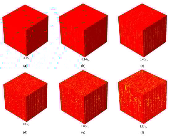 According to the constitutive law of elastic damage, the element gradually deteriorates. It is important to emphasize that the finite element analysis will fail if the modulus equals zero. Therefore, the limit of the elastic modulus is specified as a relatively small number, i.e., 10−5.
