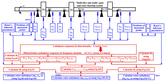 The identification procedures used in SDA and TODA to estimate the rotor unbalances ( m u j e j , α i ) of all discs are defined in Figure 2.