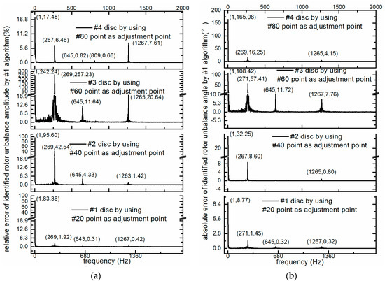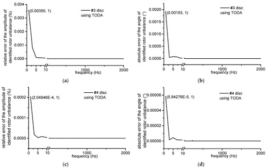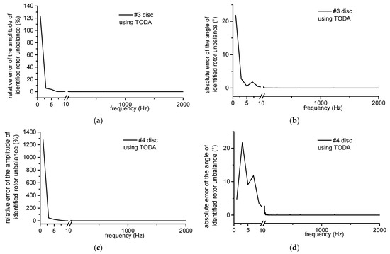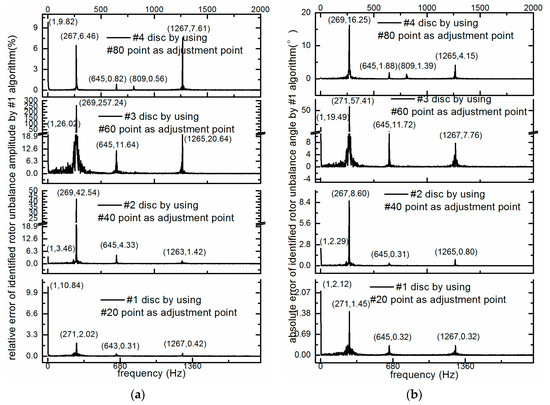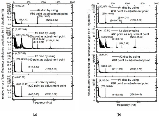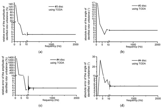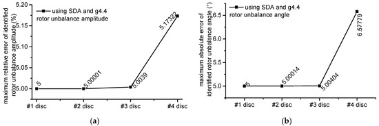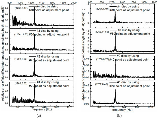 Therefore, the amplitude and angle of each eccentric disc’s unbalance can be calculated based on Equations (21) and (22). There should be m + n unbalance responses in both the x and y directions to obtain the matrix H 2 and H 4 . If an eccentric disc’s unbalance is to be identified, its unbalance responses in both the x and y directions are required according to Equation (18). Hence, there should be m + n + 1 measured unbalance responses in the two orthogonal directions. To identify all the eccentric discs’ unbalances, the unbalance responses of the measured eccentric discs must be included.