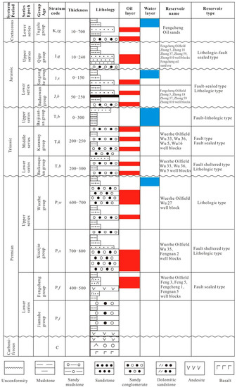 Comprehensive stratigraphic column of Wuerhe area, showing the stratigraphic conditions.