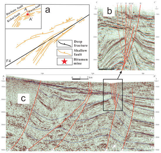 Small scale positive faults and strike-slip fault systems formed by the Yanshanian movement are developed in the shallow layer, with the characteristics of “flower structure” in their profile. The faults are broken upward to the ground surface and downward to the Jurassic and Triassic strata. The two sets of fault systems show a “Y” type combination on the section and nearly parallel extension in the plane, both striking near northeast. The interpretation scheme of shallow faults can be accurately determined through satellite photos, field observations, and wave group variation characteristics of the seismic profile in the Wuerhe bitumen vein area (Figure 3a,b). The inherited nose uplift structure and the relay communication of deep and shallow fault systems provide conditions for oil accumulation and vertical migration channel for multi-layer reservoir formation.
