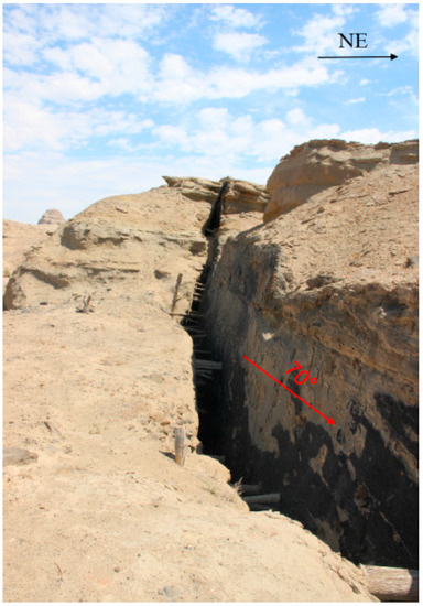 In the main part of the nose uplift, the fault system connects with a deep reservoir; oil and gas migrate to the surface via the fault system and forms bitumen through secondary action. The distribution of veins is controlled by the fault system, and it reflects the spatial distribution characteristics of faults (Figure 4). Eighteen main faults can be seen in the outcrop, forming a broom-like fault zone spreading in the southwest and converging in the northwest. The width of the bitumen vein (horizontal fault distance) generally ranges from 0.05 m to 0.5 m, the maximum being about 1.2 m. The sandstone on both sides of the vein is black owing to bitumen impregnation; it has a width of 0.5–1.5 m, forming black oil sand deposit. The mine is the only natural bitumen mine for large-scale mining in China. The proven mineral reserves are about 120,000–150,000 tons. Bitumen production began in 1958, and the maximum annual production of bitumen can reach 8000 tons. After more than 60 years of mining, only 110 m of the upper part of the ore vein has been excavated, and the lower part of the bitumen vein, that is nearly 250 m deep, is yet to be mined. The bitumen produced by the ore vein is rare, high-quality, and hard bitumen which is an important raw material for special paint and ink.