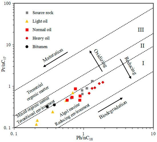 Pristane/Phytane (Pr/Ph) is an important index for judging the redox conditions of the depositional environment [2]. The ratios of the samples are 0.36–0.96, all less than 1 (Table 3). The values of Pr/ n-C17 and Ph/ n-C18 can also reflect redox conditions and their oil source correlation. The ratios of Ph/nC18 and Pr/nC17 in source rocks, crude oil, and bitumen are deposited in the reducing environment and may be related to each other (Figure 6).