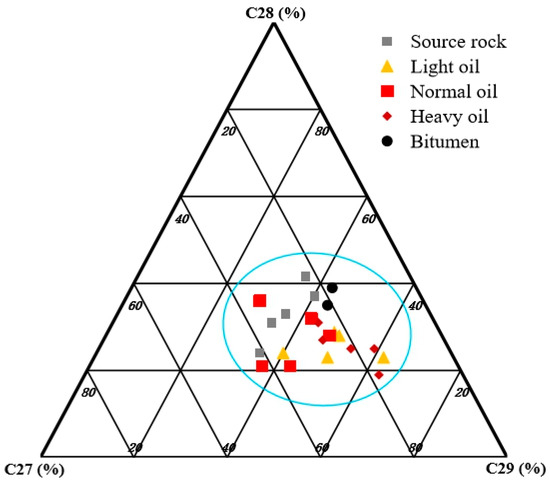 Diagram of C27-C28-C29 regular sterane content of source rocks and crude oil samples in Wuerhe area, showing a high content of C29 regular steranes.