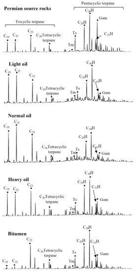The composition of crude oil changes greatly from bottom to top (Figure 5). In Permian source rocks, saturated hydrocarbons make up 75.6~90.4%, while non-hydrocarbons and asphaltenes make up 6.1~13.7%. In Permian–Triassic normal oil, 0.8400~0.8809 g/cm3 for oil density (Table 2), saturated hydrocarbons make up 63.8~85.2% of its contents while non-hydrocarbons and asphaltenes make up 6.2~20.4%. In Jurassic heavy oil, 0.9270~0.9564 g/cm3 for oil density, saturated hydrocarbons make up 31.8%~57.1% of its contents while non-hydrocarbons and asphaltenes make up 27.1~40.1%. Cretaceous solid bitumen density is greater than 1 g/cm3, average 1.1245 g/cm3. In the solid bitumen, saturated hydrocarbons make up on average 13.5% while non-hydrocarbon and asphaltenes make up on average 80.1%. From Permian to Cretaceous, the saturated hydrocarbon content of crude oil decreases, while the content of non-hydrocarbons and asphaltenes increases. Thus, it may be concluded that the group composition of crude oil is altered by secondary actions such as biodegradation, water washing, and oxidation. The content of each component in the source rock is similar to that in the normal oil, indicating that the Permian–Triassic oil is from the Permian source rock. The decrease in the content of light components (such as saturated hydrocarbons) and the increase in the contents of heavy components (such as non-hydrocarbons and asphaltene) increases the density and viscosity of crude oil.