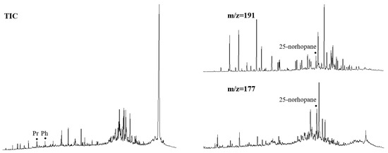 During the Late Permian Jurassic, the thrust folds and large-scale faults formed by the Hercynian Indosinian movement in the Wuerhe area determined the accumulation of oil and gas in later stages. The folds provided certain conditions for the accumulation of oil and gas in later stages. The large fault connecting the Permian, Triassic, and Jurassic strata enabled the oil and gas produced by the source rocks of the Permian Fengcheng Formation to migrate upward form three sets of reservoirs. At the time of migration, the three reservoirs were all light oil reservoirs; then, their strata denuded. Being the uplift wall of the fault, the northern strata suffered from serious denudation. As a result, the original light oil reservoir was exposed to the surface and suffered from biodegradation, oxidation, and other secondary effects, forming an oil sand deposit. In total ion chromatograms (TIC) of Jurassic heavy oil, the content of n-alkanes is very small, and the baseline is higher (Figure 9 TIC). When a “baseline bulge” of biodegradation markers occurs, it forms certain compounds, the mixture of which is collectively termed as “unknown complex mixture” [15]. As shown in Figure 9, the peaks of pristane and phytane are similar to the main peaks of C17 and C18 n-alkanes, which indicates that the biological activity is strong. The nC17 and nC18 concentrations are greatly reduced by strong biodegradation of crude oil. Meanwhile, 25-norhopane, considered as the biodegradation product of crude oil, was also detected in heavy oil (Figure 9 m/z191); 25-norhopane is also known as 10-demethylhopane or demethylated hopane or degraded hopane. In the process of degradation, bacteria first consume light components such as n-alkanes, which lead to the enrichment of oil with heavy components and increases the oil density and viscosity. In the weak denudation nose bulge, the depth, temperature, and other conditions are suitable for the survival of microorganisms. The original light oil reservoir must have been seriously biodegraded and washed out to form a heavy oil reservoir.