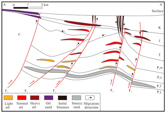 Like a plug, the Cretaceous bitumen deposits block the migration of oil and gas to the part. Owing to the plugging effect of the “bitumen plug”, the oil and gas in the lower part could not move upward, and therefore, they were preserved. A multi-layer reservoir formation model has been analyzed depicting entire strata of the study region, i.e., the Permian–Triassic light oil reservoir, the Jurassic heavy oil reservoir, the Cretaceous oil sand, and the bitumen (Figure 10).