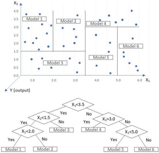 The M5 Model Tree algorithm, used as a splitting criterion, was originally established by Quinlan in 1992 []. MT combines a conventional decision tree with the possibility of generating linear regression functions at the leaves. The M5 tree is a piecewise linear model, standing between linear models such as ARIMA (Autoregressive Integrated Moving Average) and nonlinear models as ANNs. Smoothing and pruning is performed to the trees to overcome the over-fitting problem. For decision tree, the splitting criterion is based on the standard deviation error reduction of the values in the subset T of the training data that reaches a particular node (which is an analogue of entropy). For further details of M5 Model Tree, readers are directed to [,]. The figure below shows how the M5 algorithm is used for inducing a Model Tree [] in the present study. A typical Model Tree is shown in Figure 1.