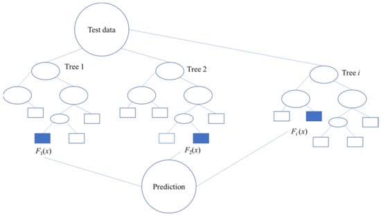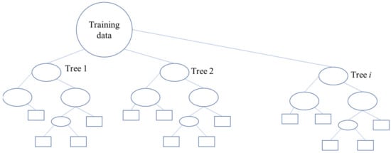 Random Forest is a non-parametric and semi-unsupervised algorithm within the decision tree family, encompassing a collection of uncorrelated trees to generate predictions for regression and classification purposes []. It combines bagging and ensemble learning theory with the random subspace method. This method allows the combination of multiple decision trees to obtain the output, instead of only depending on individual decision trees. Random Forest applies multiple decision trees as base learning models. One can randomly perform row and feature sampling from the dataset forming sample datasets for every model (bootstrapping []). Random Forest is a classifier involving a compendium of tree-structured classifiers: {h(x, Θi), i = 1 …}, where {Θi} are independent and similarly scattered random vectors and each tree forms a unit vote for the most popular class of input x. The splitting continues until the error goal is met. A bootstrap re-sampling is applied to sample the initial data and create a set of training samples. Each training sample randomly includes the relevant attributes across random subspace techniques to build the decision tree. The optimal result is achieved by voting or averaging method. The analysis of the variable importance in modelling the behaviour of response variables is feasible with RF, using variable importance metrics in two stages [,]. Figure 2 shows a Random Forest regression for a typical model.