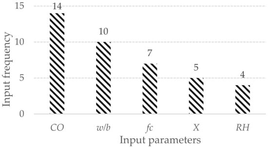 The standalone equation, besides being user-friendly, also reflects the importance of each parameter by its inclusion in the equation. GP has a unique characteristic in which the parameter that does not contribute significantly to prediction is removed. MGGP also displays the importance feature in prediction through input frequency analysis. The importance parameter CO has prominently been seen to be followed by w/b, fc, RH and X parameters. This input frequency analysis (Figure 7) also adheres to the fundamental knowledge on the concrete carbonation process.