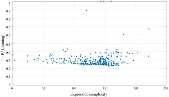 Figure 8 shows the accuracy versus the complexity of the developed models through a Pareto chart. There, the models with good performance are shown to be far less complex, as seen in the green dots in the Pareto chart. The red circle in Figure 8 for MGGP designates the best model described in this study, which is not outperformed by any other model regarding its simplicity and fitness. Thus, the equation of the MGGP model is the least complex and best fitted model out of the 1500 developed. From the Pareto front (Figure 8), developers can decide whether the incremental gain in performance is worth the related model complexity. The MGGP concept considers the analysis of multiple models, offering a superior number of alternatives to the stakeholder. A single model can also be chosen according to specific application constraints or demands.