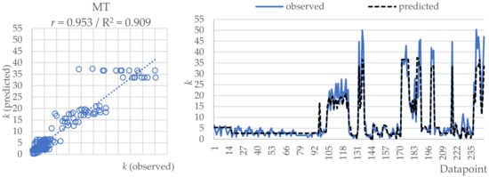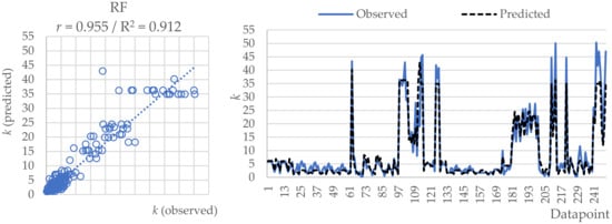 Performance indicators of the developed models, obtained from the testing samples, are shown in Table 4. The computational time to build the Model Tree (MT) is 0.08 s and 0.01 s to test the model, for Multi-Gene Genetic Programming (MGGP), the computational time is 14 min and 88 s, while for Random Forest (RF) the computational time is 40.5104 s. The performances of MT and RF are on par with the excellent performance of r = 0.953 and r = 0.955, respectively. MGGP, with r = 0.936, is close to, but below, the accuracy displayed by MT and RF, presenting simultaneously higher RMSE and MSE values. All these new models present lower RMSE values than those proposed in [], developed using ANN and GP techniques. The former were developed with the purpose of overcoming the issue of having to consider two models when using the MLR technique, as in [], due to the non-monotonic influence of RH in carbonation, as explained before. However, this use of two models, with RH playing the role of the splitting criterion, may be faced as a particular Model Tree. Thus, the performance indicators for the ensemble of the two MLR models proposed in [] were computed, delivering values of r = 0.867, RMSE = 7.344 and MAE = 4.904. Therefore, MT, RF and MGGP models constitute an improvement concerning concrete carbonation coefficient prediction.