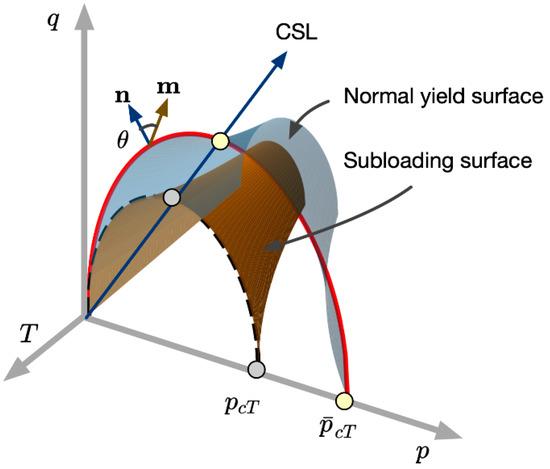 where is the slope of the critical state line in the plane. is the temperature-dependent preconsolidated pressure that controls the size of the normal yield surface and is calculated by Equation (7).