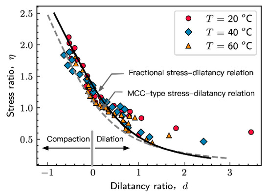 Figure 5 shows the fitting results of the fractional stress–dilatancy relation on the experimental data of Bourke clay (Uchaipichat and Khalili [24]) at different temperatures. It can be found that the fractional stress–dilatancy relation has a better performance than the stress–dilatancy relation of the modified Cam-clay model, especially at a low-stress level.