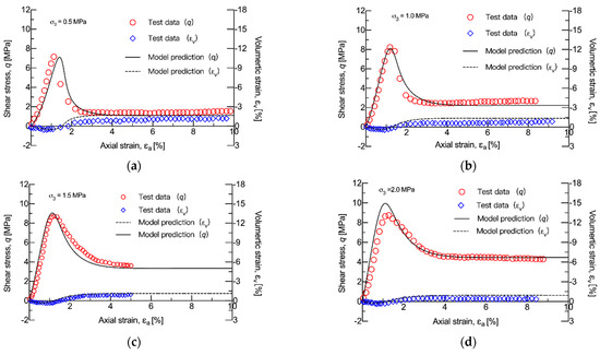 Figure 6 shows the measured stress–strain curves and volumetric deformation of sedimentary rock under the drained compression condition with various confining pressures. It can be found that the volume of rock samples is first reduced and then expanded during shearing. Once the peak strength state is reached, continuous loading will lead to the strain-softening phenomenon, and the rock sample can still resist extra deformation at the critical state. The proposed model can accurately describe the abovementioned features.