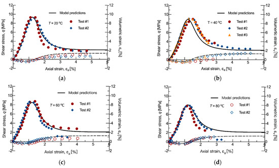 In addition, to consider the temperature effect on the behaviour of soft rock, the experimental data of Ohya rock (Zhang et al. [10]) is adopted here and predicted by the proposed model. The cylindrical specimens with 50 mm in diameter and 100 mm in height were obtained from Ohya Village of Tochigi Prefecture. Before shearing, the specimens were first isotropic consolidated for 24 h under the prescribed confining pressure ( MPa) and then heated to the target temperatures of 20 °C, 40 °C, 60 °C, and 80 °C, respectively. The specimens were then sheared at the rate of 0.001%/min under drained conditions with the temperature remaining unchanged.
