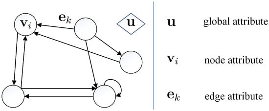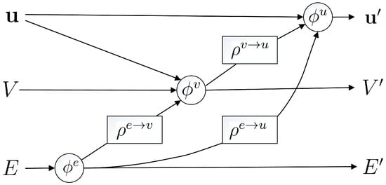 where , , and . The “update” functions , , are mapped across all edge, node, and global attributes to update the corresponding attributes, respectively. The “aggregation” functions , , are used to reduce the effect of the set input (i.e., , , ) into a single element effect that represents an aggregated information. The steps of computation in the graph network block is shown in Algorithm 1 and Figure 3.