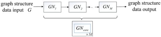 The third is to construct the graph neural network by composing the graph network block. Because the above graph network block is defined as always taking a graph comprised of edge, node, and global attributes as input, and returning a graph with the same constituent attributes as output, it ensures that the output of one graph network block can be passed as the input to another graph network block. Therefore, the graph network block can be composed to achieve the graph neural network. In the most basic form, two graph network blocks can be composed by passing the output of the first graph network block as the input of the second graph network block. It can be written as , where represents the second graph network block, represents the first graph network block, and G means the graph structure data. Figure 4 presents the construction of the graph network blocks.