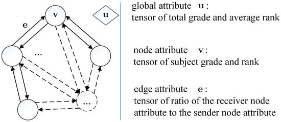 After the examination data has been complemented, the corresponding graph structure data can be represented. The corresponding graph structure data of the subject grades in the second semester mid-term exam in the 2016 school year is illustrated as an example. The node attribute of maths is , which is the tensor of maths grade and rank (in class). The edge attribute is the tensor of the ratio of the receiver node attribute to the sender node attribute. The edge attribute is , if the receiver node is maths and the sender node is physics (the node attribute of physics is ). The global attribute is the tensor of the total grade and average rank (in class), which is .