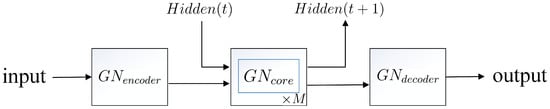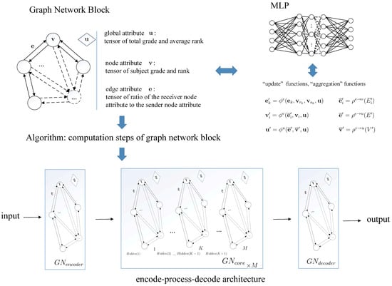 Finally, compose the graph network blocks to build the graph neural network which is used for the personalized grade prediction. We compose the graph network blocks in an encode–process–decode architecture, as shown in Figure 6. represents the encode graph network block which encodes the input data to graph structure data. Similarly, means the decode graph network block which decodes the output graph data (of ) to student grade data. is formed by composing multiple graph network blocks (number of M) in sequence. t represents the sequence index, i.e., the examination index. is the output of in t iteration.