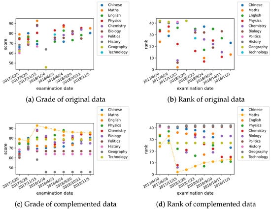It can be seen that some subject grades and ranks in some examinations are not recorded. That cannot be used to train or test the proposed grade prediction model. Therefore, we utilize the linear interpolation method [] to complement the “null” data. The result can be seen in Table 3. Table 2 and Table 3 are visualized and compared, as shown in Figure 8. From Figure 8a,b, it can be seen that some subject grades and ranks of the examination (i.e., the first semester final exam in the 2017 school year) are missing. In Figure 8c,d, the missing grades and ranks have been complemented. The dashed line of the grades and ranks of maths in Figure 8c,d illustrates the nonlinearity of the student grades and ranks.