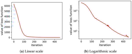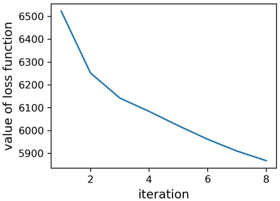 The performance of the proposed model can then be investigated through the loss function and the error between the predicted grade and the test grade. Firstly, we test the performance of the graph neural network for predicting the grade of student 14295 with the data of nine examinations. The grades of the previous eight examinations are used for training and the grades of the ninth examination are used for testing. The curve of the loss function value shows the performance, seen in Figure 9. Considering that the last value (also the minimal value) of the loss function is , the prediction error (between the predicted grades (of the ninth examination) and the test grades (of the ninth examination)) should be extremely large.