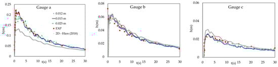 Regarding the two fine refinement meshes, the finest one gives the smallest RMSE of water depth at points a, b and e. However, the quality of cell size 0.015 m seems better at other gauges. This trend is also observed in the u–velocity component. In contrast, the CPU time of the finest resolution mesh is much more expensive than those of the finer and coarse ones. Therefore, 0.015 m is the optimized grid size, in terms of both mesh quality and processing time.
