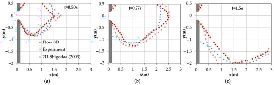 Flood extent at downstream. (a) t = 0.50 s, (b) t = 0.77 s, (c) t = 1.50 s.