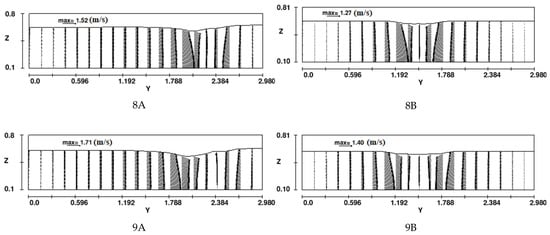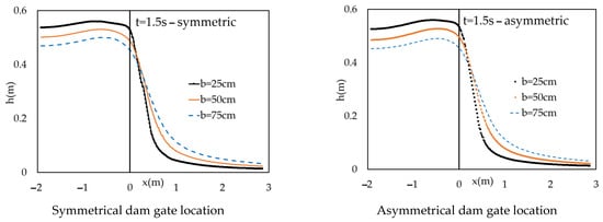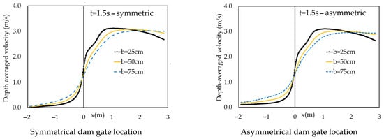 Figure 6 and Figure 7 present water depth and velocity profiles at the center of the reservoir’s mouth when t = 1.5 s. The dam–break wave propagation is reduced by decreased breach width b and depends slightly on location of dam gate (Figure 6). Conversely, the wave front of velocity downstream decreases from b = 0.25 m to b = 0.75 m, and is independent of the reservoir outlet’s position. The numerical result of depth–averaged velocity gets its maximum value at x = 1.0 m in both 7A and 7B, then is gradually disregarded. While the value generated by larger breach size increases near the dam site and remains constant for the rest of the floodable area. On the other hand, the intersection point of three water depth profiles is after the dam site’s place in both cases of dam gate’s location, while the conjunction of 3 velocity profiles is placed at x = 0.