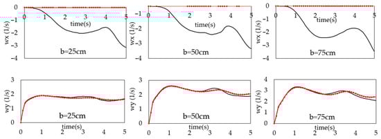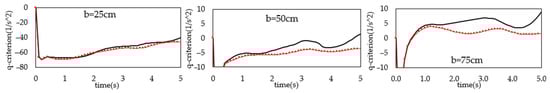 Vorticity components wx, wy, wz represent the rate at which a fluid element rotates around its pivot axis [28]. The major effect of the opening gate’s location is observed in both values wx and wz. Negative value of horizontal vorticity wx and positive value of vertical vorticity wz present counterclockwise and clockwise rotations in models 7A, 8A and 9A during dam–beak time (Figure 11). While these values are negligible, due to the symmetrical dam’s mouth, it means there is no rotational flow formed in both x and z directions. Conversely, regarding time variation, clockwise wy vorticity slightly depends on the position of the dam gate in the first 5 s period, except at the end of this period. Magnitude of wy increases rapidly from b = 25 cm to b = 75 cm.