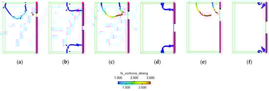 fx–vortex core strength at early stage of dam breach at t = 1.5 s. (a) 7A, (b) 7B, (c) 8A, (d) 8B, (e) 9A, (f) 9B.