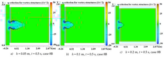 Contour maps of q−criterion at t = 0.5 s at different water depths.