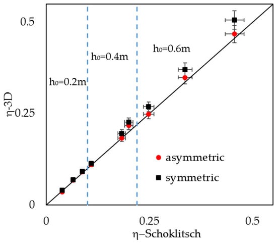 Table 4 shows the dependence of ratio with b/B and initial water depth h0 (m); Qp (m3/s) is peak discharge. The range of b/B in this study is from 0.08 to 0.25, which has rarely been studied in previous literature. When h0 remains constant, η calculated by Schoklitsch’s formula is also constant. However, this value is varied and increased when water stage increased. Most numerical results are greater than the analytical solution of Schoklitsch (1917) and symmetrical location of dam gate gives values of η greater than the asymmetrical one. Ascending initial water stage is, significantly, the difference between η–Schoklitsch and η–3D,B. Regarding breach width b = 75 cm, 4.6%, 8.3% and 10.8% are the absolute error of η–Schoklitsch and η–3D,B corresponding with 3 values of water depth 20 cm, 40 cm and 60 cm, respectively. The scatter plot of comparison between peak discharge of models A and models B, with the analytical result of Schoklitsch, is reported in Figure 17. The former is closer with a diagonal line, than the latter, and all of them are greater than the analytical solution. Therefore, the VOF–LES model is straightforward in exactly capturing 3D hydraulic features of dam–break wave propagation.