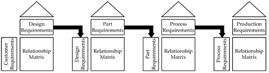 The classical approaches for QFD are the Akao approach, four-phase approach (American Supplier Institute approach) and the matrix of matrices approach. The four-phase approach is defined in Ref. [84] as a set of matrices with defined inputs and outputs (see Figure 1). The first phase involves the translation of customer requirements into measurable quality characteristics. The second phase translates the quality characteristics into components and parts of the product. At the end, these elements are prioritized based on the degree of fulfillment of the required quality characteristics. In the third phase, the manufacturing processes and specifications, which, in the fourth phase, are defined as work instructions, control plans and training requirements necessary for realization [86,87,88,89,90], are prioritized.