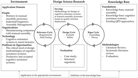This research approach to design and configure a cognitive assistance system in manual assembly is based on an adapted QFD methodology, further on defined in our work as “cognitive assistance system-QFD (CAS-QFD)”. The presented gap in studied literature and current research leads to the questions as to how: (research question 1) a systematic approach for the design and configuration of cognitive assistance systems for manual assembly processes can be implemented by using an adapted QFD approach; (research question 2) such an approach and its relevant design attributes have to be adapted with the prerequisites that future users of the assistance systems are included as well as the company’s requirements; (research question 3) an assembly process can be investigated and assistance system’s potential can be identified; (research question 4) the determined assistance system potentials can be correlated and specific steps for realization can be implemented.