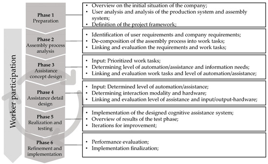 The phases and the included steps should not be understood as a pure assessment tool. Instead, with the help of the developed logic for the design of cognitive assistance systems, it should offer the possibility of finding suitable alternatives through iterations of multiple trials. For this purpose, the steps can also be executed in a different order or can even be examined in parallel to each other.