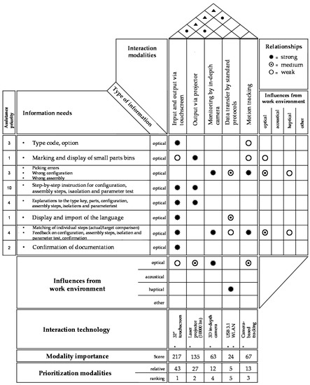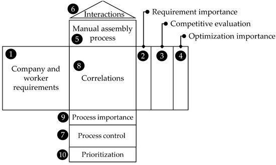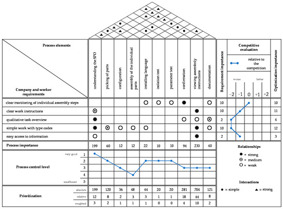 Now, the assembly process and the work tasks within the assembly process are defined (step 5, Figure 4). The process is modeled in advance using suitable methods (e.g., value stream mapping, precedence graph). The correct level of detail for capturing the requirements and assistance functions must be determined. In the house of quality, the interdependencies/interactions of the process elements are analyzed and the strength of the influence is defined (step 6, Figure 4). Knowledge of the interactions is important for the subsequent design of the assistance functions since the interactions of the process elements also cause the interdependencies of the assistance functions and cannot be considered isolated. Process control is graded in comparison to the competition (scale: 1 = very good to 5 = insufficient) (step 7, Figure 4). This allows the potential for optimization to be derived. The correlation between process elements and requirements is performed in the next step (step 8, Figure 4). For this purpose, the correlations must be identified and weighted (Table 4). This identifies the process elements that have the greatest influence on the satisfaction of workers and the company.